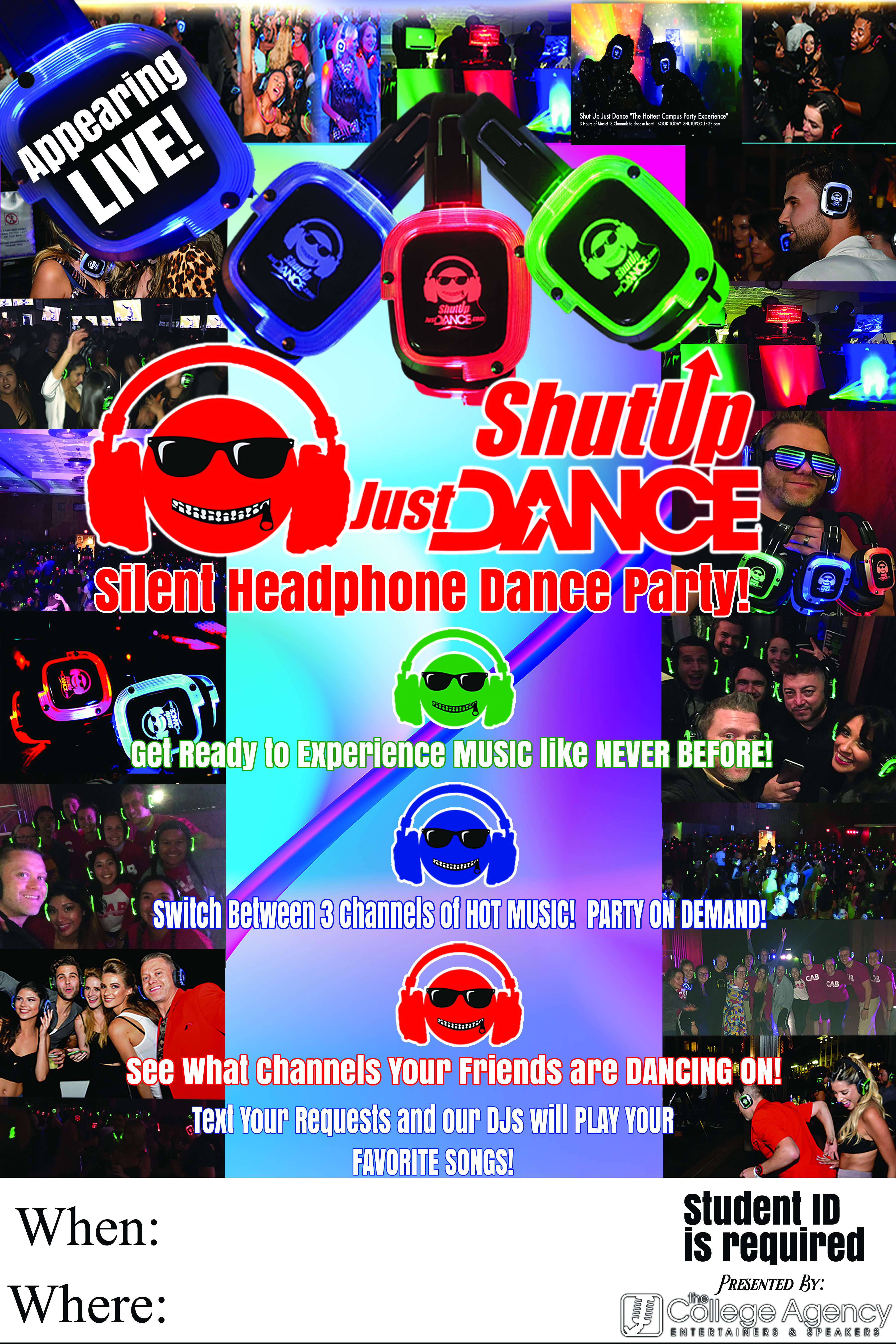 Need a solution to a noisy problem? Want to dance during the day, but classes are going on? Tired of the same old DJ Party & want to shake things up? WE HAVE YOUR SOLUTION! Grab your Shut Up Just Dance headphones and choose from the DJ-Red, DJ-Blue, or DJ-Green channels and get ready! Shut Up Just Dance delivers 3 incredible options for multiple show experiences. Using their QR code technology, your students will text in their requests and dance away! This is not a sit back and listen kind of silent headphone party, this is the Shut Up Just Dance experience!